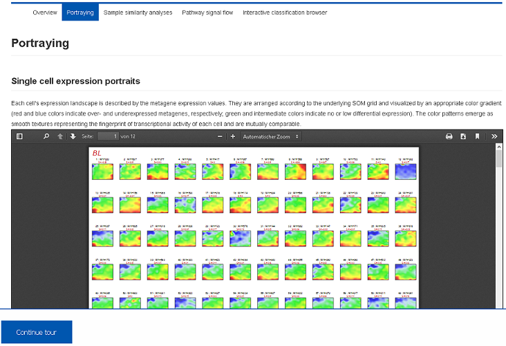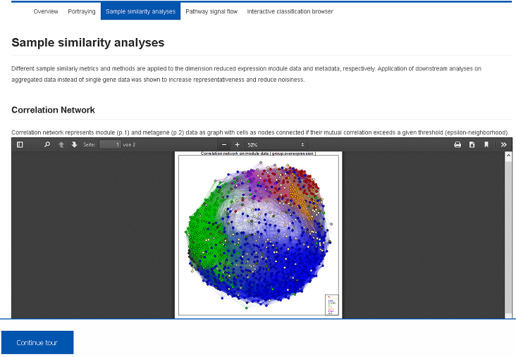 For each patient the SOM-method provides a ‘personalized’ portrait of the expression landscape serving as fingerprints of transcriptional activity of the samples. From these fingerprints, co-regulated gene modules are extracted and characterized. Report PDF files are stored in the Health Atlas and can be downloaded or previewed using the browser.II) Sample diversity analysis (Demo-Link)