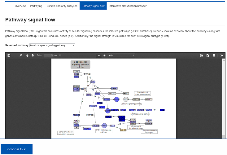 We applied Pathway Signal Flow (PSF) algorithm to calculate activity of cellular signalling. Importantly, this approach explicitly involves pathway topologies and provides proper visualization of the signal strengths. Several pathways can be inspected using the select box.IV) Alternative classifications (Demo-Link)