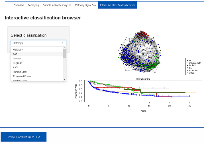 Several molecular, clinical and phenotypical classifications were applied to this data set. This Shiny app visualizes distribution of the subgroups in the sample correlation network and provides the corresponding survival curves. Several alternative classifications can be inspected using the select box.5. Results and Outlook